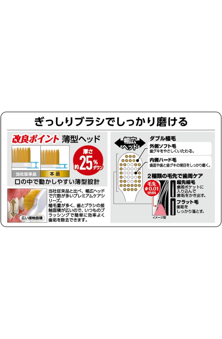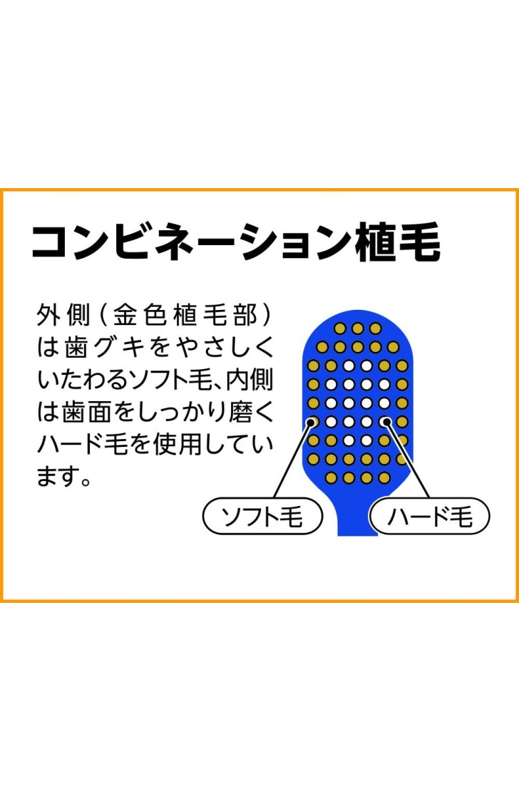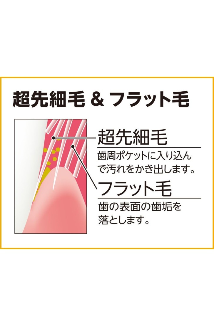 • 歯周ポケットに入り込んで汚れを落とす「超先細毛」と歯面に付いた汚れを落とす「フラット毛」の2種類の毛先を使用しています。外側(金色植毛部)は歯ぐきをやさしくいたわるソフト毛、内側は歯面をしっかり磨くハード毛を使用しています。