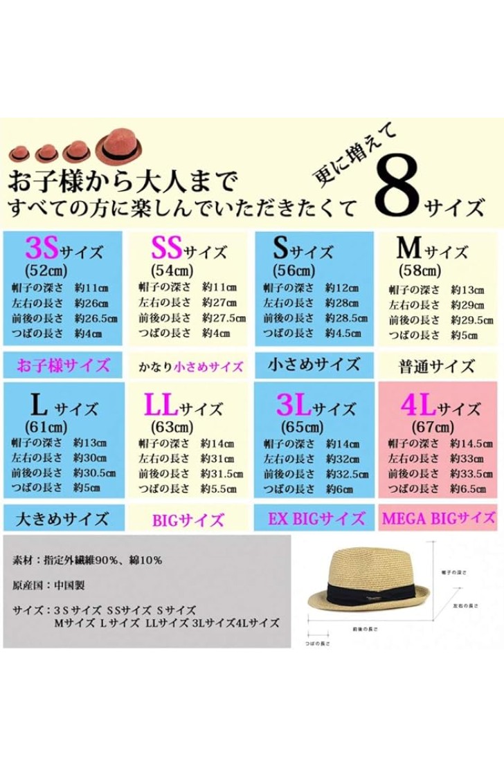 • サイズ:3S 52cm / SS 54cm / S 56cm / M 58cm / L 61cm / LL 63cm / 3L 65cm / 4L 67cm / 小さいお子様から大人の大きいサイズの方まで。小顔効果抜群。