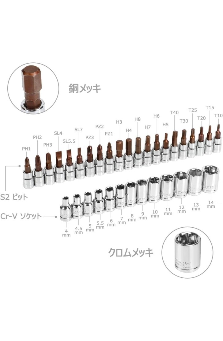 - 【材質】錆ににくい高品質なCrv(ソケット)とS2合金鋼(ビット)で、完全的に熱処理され、高硬度、高靭性、耐久性を実現しました。特にビットは腐食に耐えるように銅メッキされています。