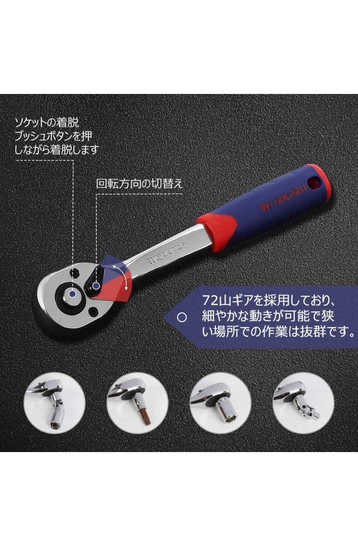 - 【特徴】ラチェットハンドルはクイックリリースのデザインで、ソケットの脱着はボタンを押すだけで簡単にできます。作業中に手が当たりにくいようにハンドル部はオフセットされています。72山ギアを採用しており、細やかな動きが可能で狭い場所での作業は抜群です。