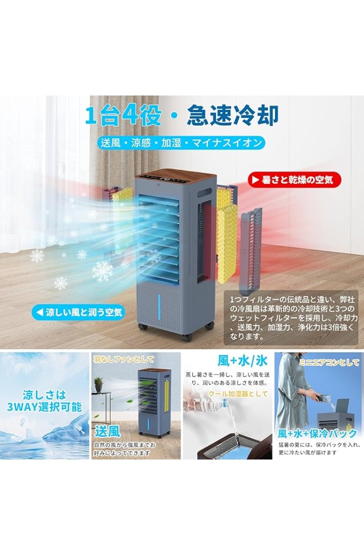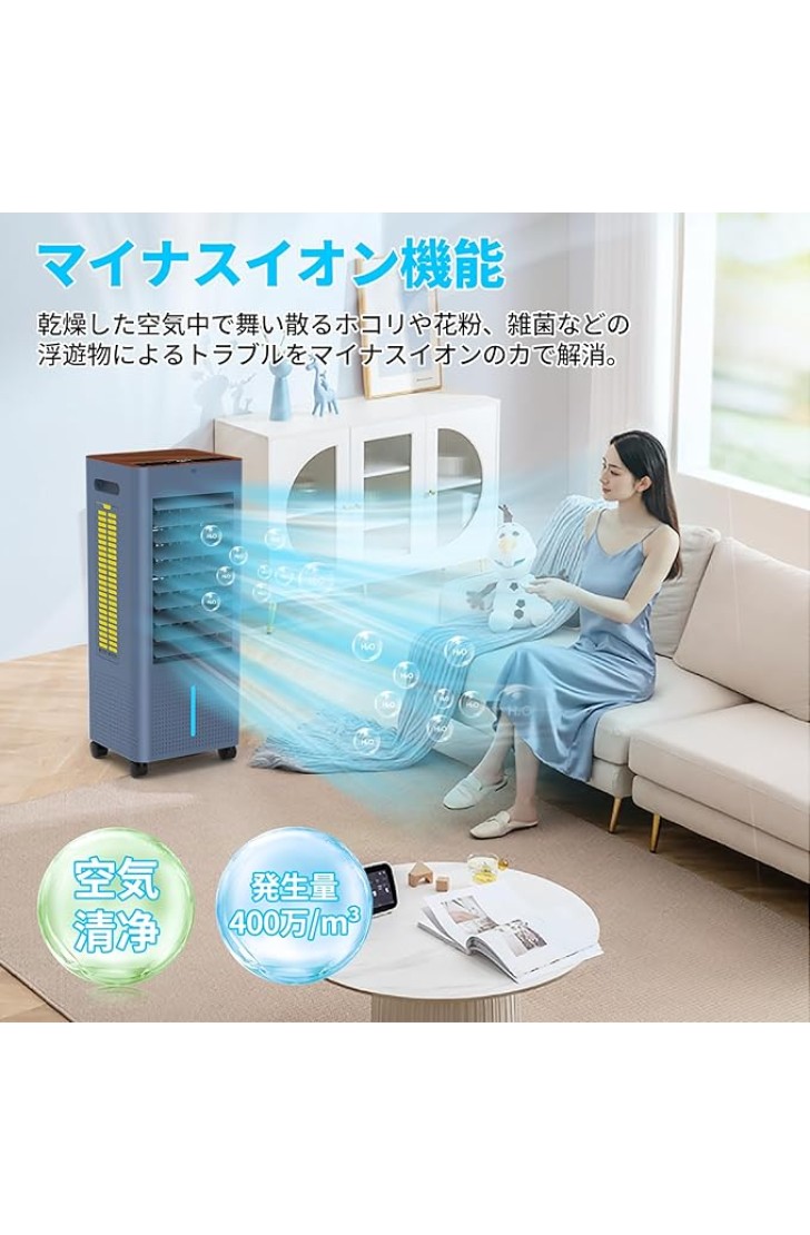 - 【3面ウェットフィルターで強力冷風&400万マイナスイオン空気浄化】多機能 冷風機 は2024年革新の霧化冷却技術と背面+左面+右面合計3面ウェットフィルターを採用して冷却力は類似品より6倍が増加し、冷房効率は大幅に上げ、短時間に迅速に冷却することを役に立ちます。更に、最大7mまでの送風距離で強力とともに急速に周りの空気を冷やさせ、加湿させ、浄化させ、最後に涼しい風を届けます。真ん夏にタンクに氷や付属の保冷バックを入れば自宅に涼しさと快適さを楽しめます。なお、当店の 扇風機 だけは本物の高濃度400万のマイナスイオン機能を搭載されています、お部屋の空気を冷却しながら浄化させ、空気を綺麗且つ新鮮になり、換気と冷却の効果同時に実現し暑く濁った空気が一掃されます。