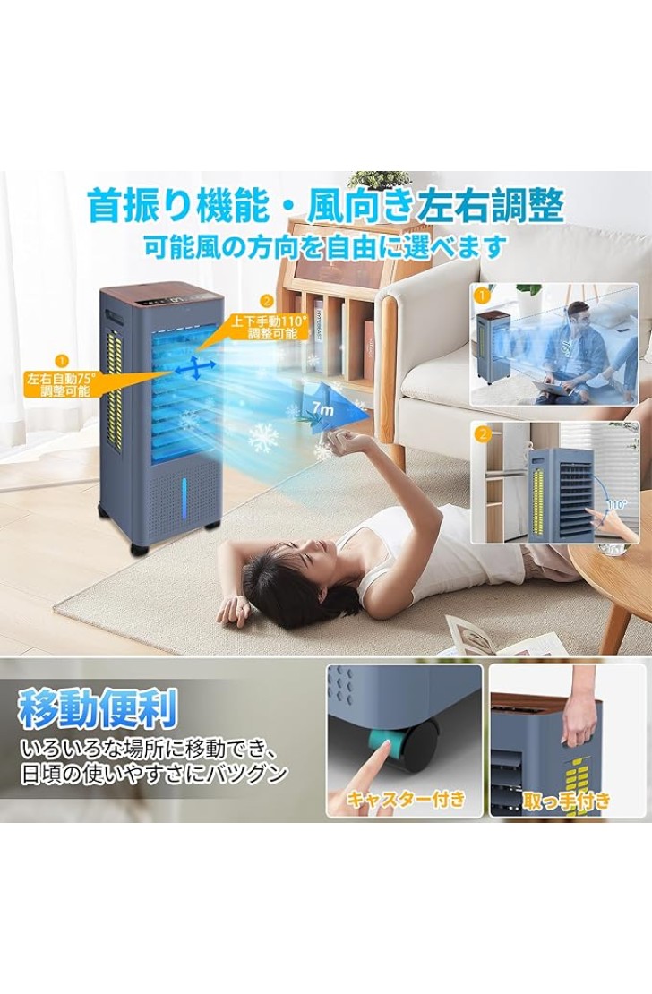 - 【左右自動75°・上下110°風向調節】 冷風機 は上下ルーバーを手動110°まで風向調節可能、更に左右ルーバーも付いており、スイッチを入れると風を自動的に左右75°に振ってくれて、より広範囲に冷却できて、暑い季節に涼しさはすばやく部屋に充満させ、あなたに爽やかで包み込まれて、気持ちよい室内環境を作ります。もっと広範囲に涼風を届けるために、冷風扇は左右約45°の自動首振りの角度調節機能を搭載され、上下約120°の手動スイングの角度調節ができます。涼しい空気の流れ範囲を最大限に広げ、より自然の風に近い涼風を送ります。