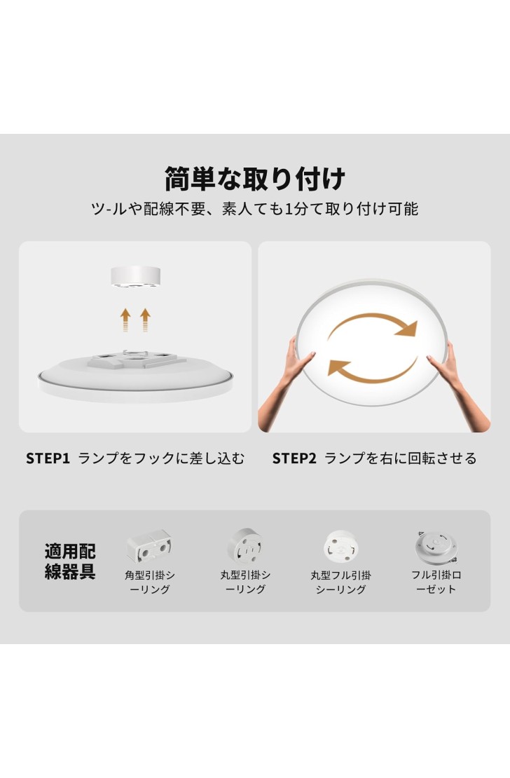 - 【ワンータッチ取付け】アダプターとライト本体の一体化設計のため、部品組み立ての必要がなく、シーリングライト全体を天井の引掛け装置に押し込んで、右回りに回転するだけで設置完了です。工具・配線も必要がなく、素人で1分間で取り付けます!