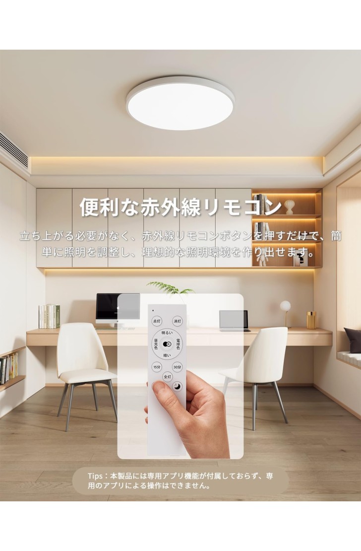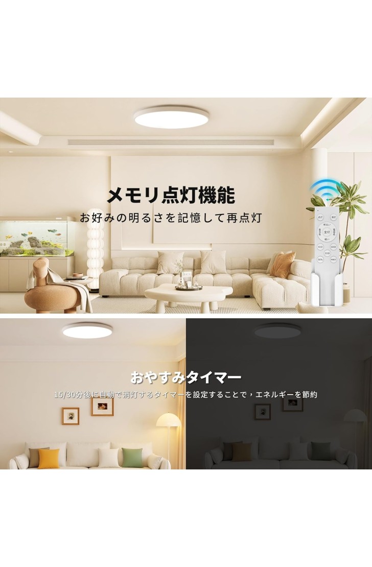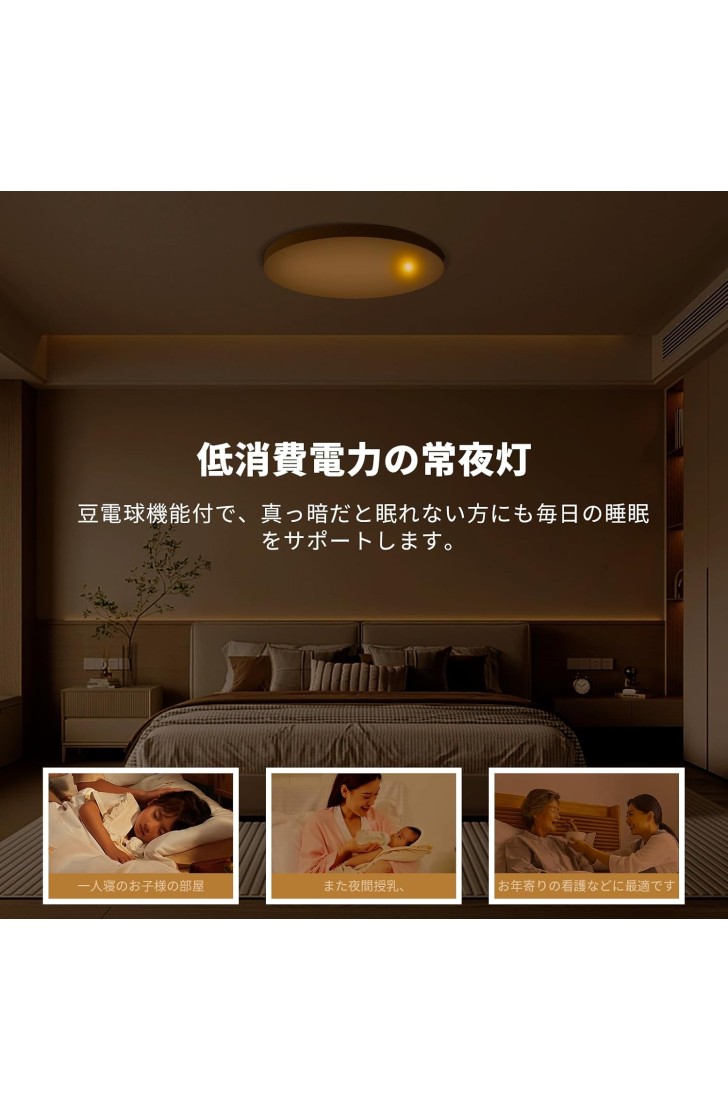 - 【豆電球常夜灯・記憶機能・定刻消灯】○本格的な豆電球常夜灯(1W):他社の眩しい全体発光式常夜灯と違って、1点だけ発光のため、ちょうどいい感じの暗さで目への刺激がなく、付けまま寝ることに最適です。○進化した記憶機能:他社の記憶機能は常夜灯によって前の設定がリセットされる方が多く、当天井照明器具はいろいろ設定してから常夜灯を使っても、次回点灯時にきちんと常夜灯前の設定を再現しますので、設定がリセットされるため毎日設定し直しの悩みがなくなります!○消灯機能:設定して15/30分後自動的に消灯するため、消し忘れの心配はありません。
